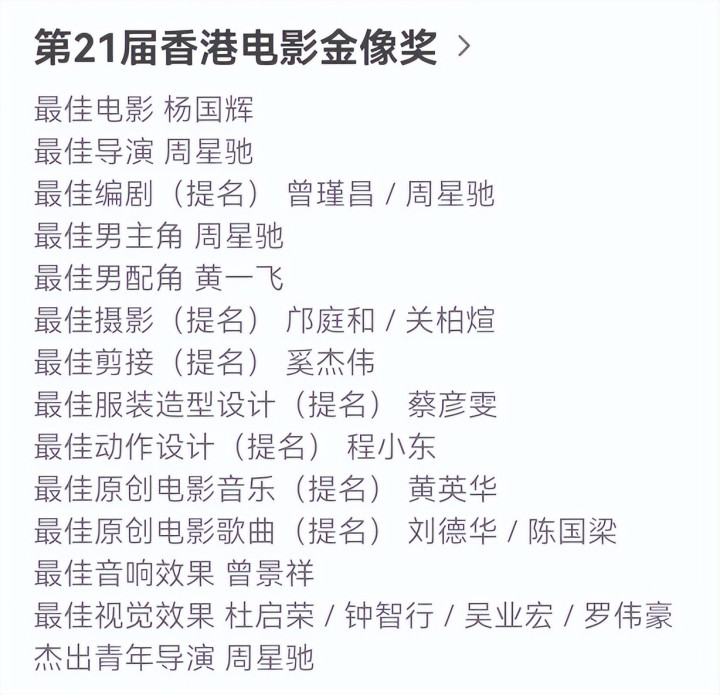 而在第21届中国香港电影金像奖上,《少林足球》还获得过十几项提名,其中担任导演、编剧兼主演的周星驰,更是捧回了最佳导演和最佳男主的奖杯。