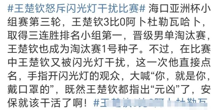 无独有偶在小组赛第二轮王楚钦对阵印度选手阿卡什·帕尔第二局9比6王楚钦领先的时候,观众席上有位观众突然大喊,这是因为观众席上有人开了闪光灯,这位大喊的观众就是怒斥这位开闪光灯的观众,但是因为这位球迷的声音太大,影响到了场上的运动员,于是王楚钦直接发火,指着这位观众:闭嘴吧!