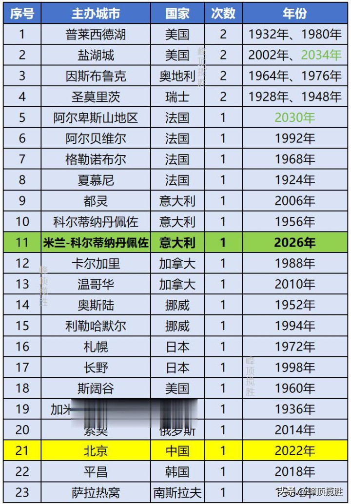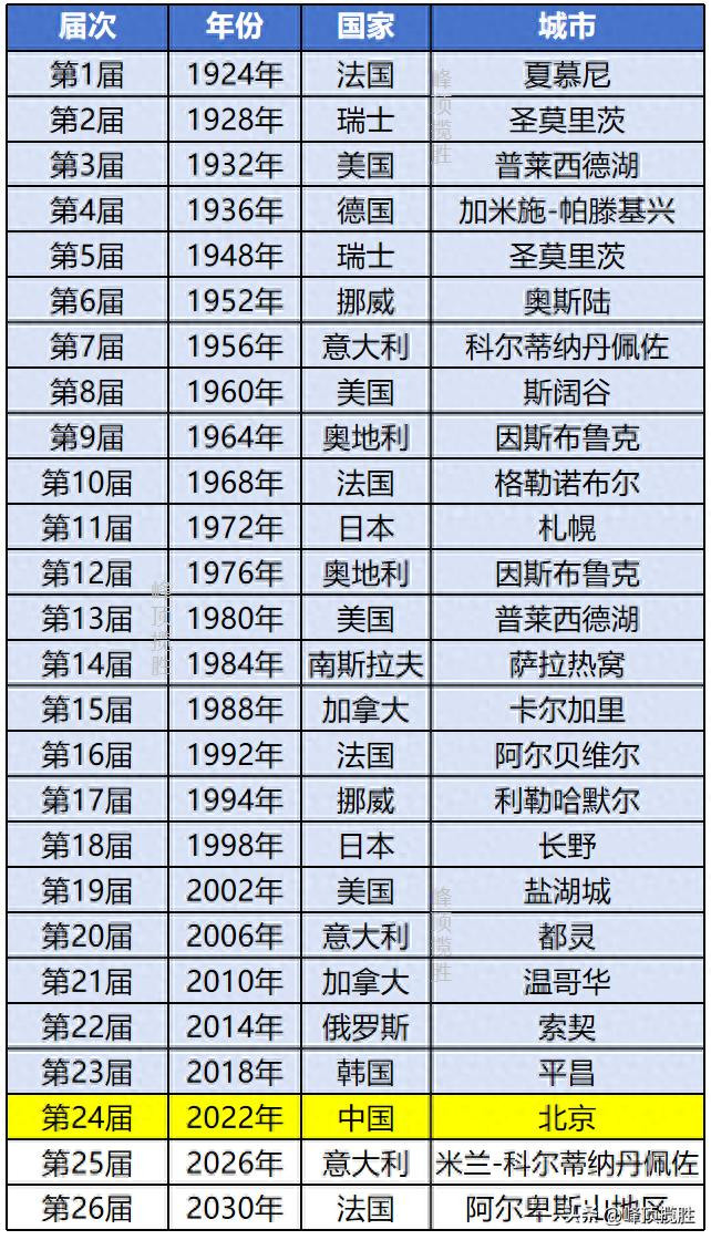 冬奥会已举办了24届,确定主办城市已排到2030年的第26届。